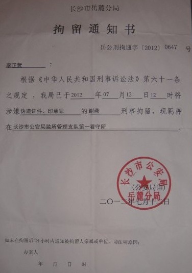 期间,谢燕一直在没有任何手续的情况下遭到关押。7月15日,谢燕的丈夫李正武第三次到岳麓派出所要求放人,周警官给了一份谢燕的《刑事拘留通知书》。拘留书中称,谢燕“因为涉嫌伪造证件、印章罪”被刑事拘留,羁押于长沙市公安局监所管理支队第一看守所。