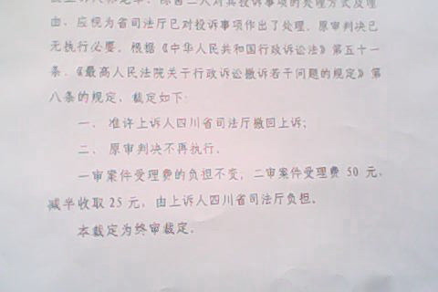 (维权网信息员刘悦报道)7月18日上午,成都访民陈茜接青羊区法院通知,到青羊区法院去拿成都中院的二审裁决,拿回一看,成都中院居然做出如此荒唐的裁定: 一、准许上诉人四川省司法厅撤回上诉。 二、原审判决不再执行。 一审案件受理费的负担不变,二审案件受理费50元,减半收取25元,由上诉人四川省司法厅负担。 本裁定为终审裁定 二审上诉人撤诉,却裁定不执行一审判决,这是哪国的法律规定的?