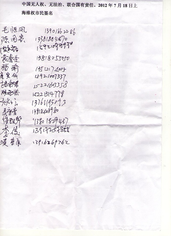 活动最后100多名上海访民签名:强烈要求包括联合国在内的国际人权组织关注中国不断恶化的人权状况,对中国政府违反《世界人权宣言》的行为予以强烈谴责!敦促中国政府重视人权,改善国人的生存状况!
