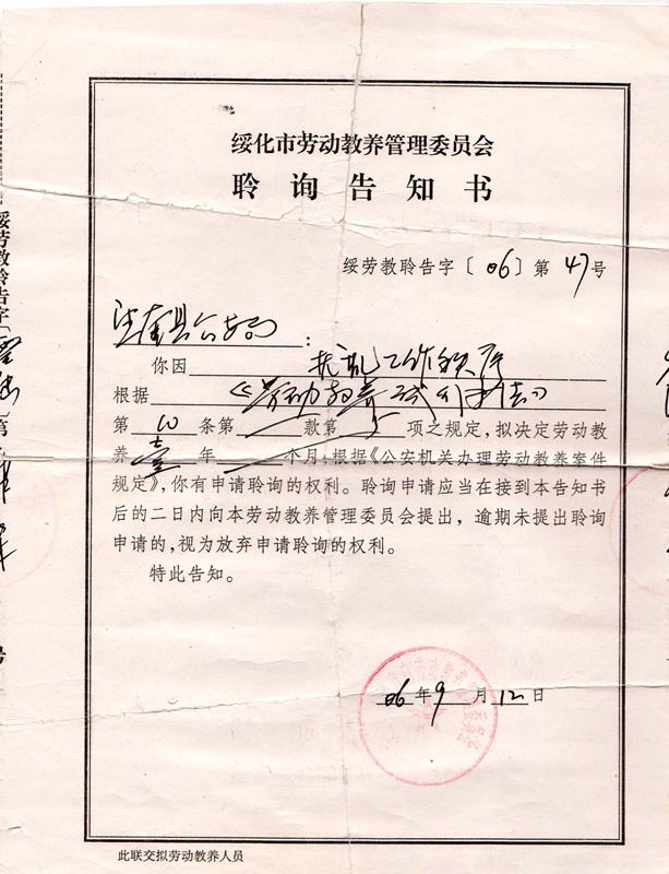 9月30日,黑龙江省绥化市望奎县公安局没有走任何法律程序,没有出具任何法律文书,就将一个没有违反国家任何法律患有多种重大疾病(被切除三个器官的癌症患者)的无辜者送入黑龙江省戒毒劳教所。把一张2006年第47号聆询告知书塞在张淑芝手里,告知她被劳教一年。