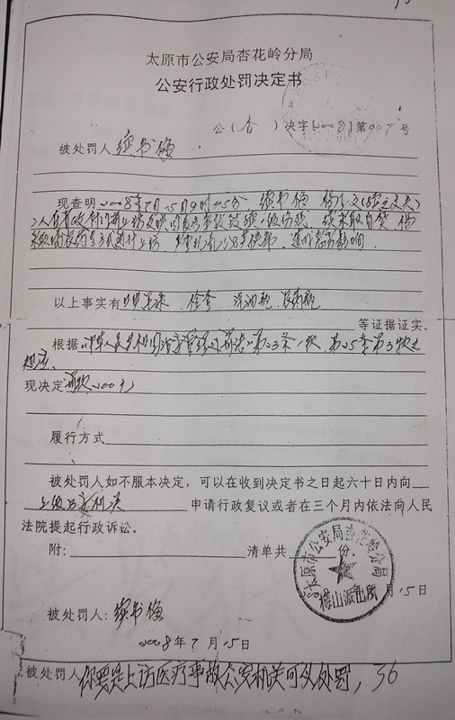 既使政府如此打击报复,仍阻挡不住续书梅对医疗事故的上访诉求。杨玉文、续书梅夫妇在冤上加冤无处说理时,于2008年7月15日近10时许,在山西省政府门前喊冤无人理时,续书梅身上浇汽油自焚未遂,杨玉文喝农药自杀,经抢救脱离生命危险。事发当日,太原市公安局杏花岭分局梅山派出所对续书梅罚款200元处罚。