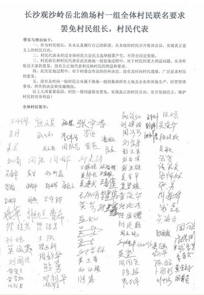 此前由于渔场村一组的集体资产和用于安置的三十多亩安置用地被违法卖掉,村民们认为是村民组长和村代表有不可推卸的责任,大家自发的组织在一起去街道和村委会要回自己的安置用地,然而作为村民组长和村代表却不出面,反而还是站在街道跟村民们做工作,大家都怀疑他们是不是为村民谋利,是不是得了什么私利,于是,村民们都强烈要求罢免现在的村组长和村民代表,实现真正意义上的村民民主自治,而不是村委会自治。