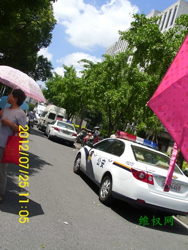 在市信访办门前停放着10多辆警车,警察及便衣在现场监控。