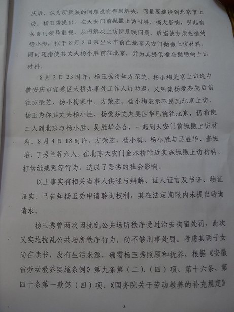 行政复议决定书中被申请人安庆市劳动教养委员会答辩称对杨玉秀决定劳动教养一年三个月的“具体行政行为事实清楚,证据确凿,定性准确,程序合法”。称“杨玉秀2010年7月底与方荣芝、杨小梅从北京上访回到安庆后,认为上访问题没有得到解决,商量要继续到北京上访,杨玉秀提出:到天安门前抛洒材料搞大影响,引起有关部门领导重视……今年2月以来杨玉秀在劳动教养所外执行期间,煽动、组织夏培勤、查政香等人商量全国两会期间赴京上访;3月5日杨小胜与夏培勤等八人欲赴天安门地区上访,被北京公安局查获”。故安庆市劳动教养委员会研究决定对杨玉秀决定:撤销杨玉秀劳动教养所外执行,投送劳动教养场所执行。执行期限从2012年3月23日起至2012年11月14日止,并及时完成了决定书送达及送所执行。