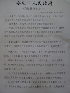 (维权网信息员周维林报道)7月26日安庆市访民杨小胜向本网信息员反映,其妻子杨玉秀被劳教后于5月16提起行政复议,杨小胜于本月24日下午15时到安庆市政府法制办询问是否作出行政复议及要行政复议决定书,工作人员称已经作出,且送达给杨玉秀了,不能给杨小胜,经杨小胜反复恳请才给了他一份行政复议决定书。杨小胜于26日到安徽女子劳教所探望杨玉秀,这才知道安庆市人民政府并未将行政复议书送达给杨玉秀。