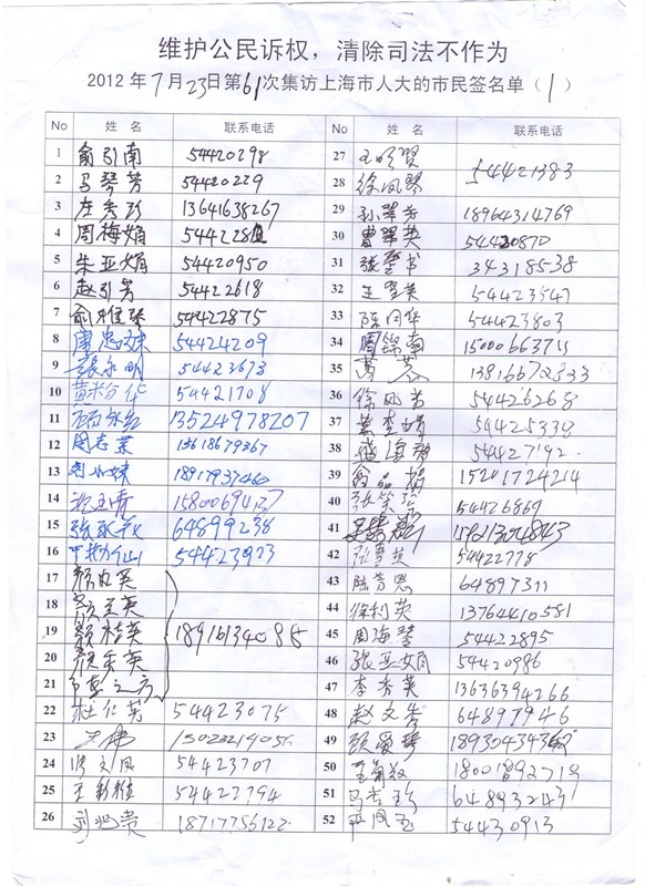 723星期一下午,79名上海市民维权者为了维护上海1060户家庭的切身利益,第61次向上海市人大常委会请愿,请求上海市人大常委会履行法定职责,监督三级法院剥夺公民诉权的不作为、乱作为行为。