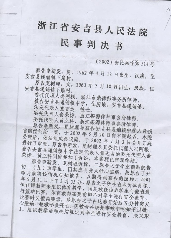 2002年5月20日,李新发、夏树理起诉到安吉县法院,要求参照《上海市中小学学生伤害事故处理条例》赔偿13万元。当时,浙江省尚无类似的法规,教育部已经制定并颁布了将于2002年9月1日生效的《学生伤害事故处理办法》,条文内容基本上相同,所以参照《上海市中小学学生伤害事故处理条例》未尚不可。安吉县法院在判决书中也承认递铺中学对李竞前的死亡有责任,但认为《上海市中小学学生伤害事故处理条例》不适合浙江,于是判决递铺镇中学赔偿李竞前父母死亡补偿费、丧葬费共8288.80元,比学校原先赔偿的还少16711.20元(判决书称学校未在庭审中提出返还,可视为其对自己民事权利的处分)。法院还判决死者父母承担本案诉讼费7110元,并限于判决生效后五天内缴纳。这样一来,李竞前的死亡补偿费和丧葬费8288.80元减去诉讼费7110元后,只剩下1178.80元了。