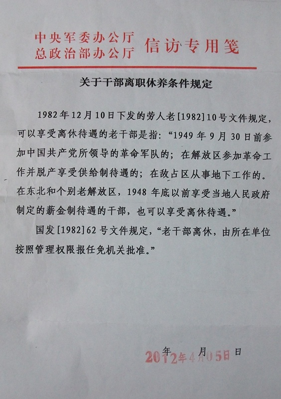 中央军委回复张善姣《关于干部离职休养条件规定》:1982年12月10日下发的[1982]10号文件规定,可以享受离休待遇的老干部是指:“1949年9月30日前参加中国共产党所领导的革命军队的;在解放区参加革命工作并脱产享受供给制待遇的;在敌占区从事地下工作的。在东北和个别老解放区,1948年底以前享受当地人民政府制定的薪金制度的干部,也可以享受离休待遇。”这是早在1982年12月10日由国务院、中央军委和民政部联合下发的文件,明确规定“1949年9月30日前参加中国共产党所领导的革命军队……”都可以享受离休待遇。而郧西县政府却歪曲这一文件,以李齐坤不是干部为由,盘剥他应享有的离休待遇。