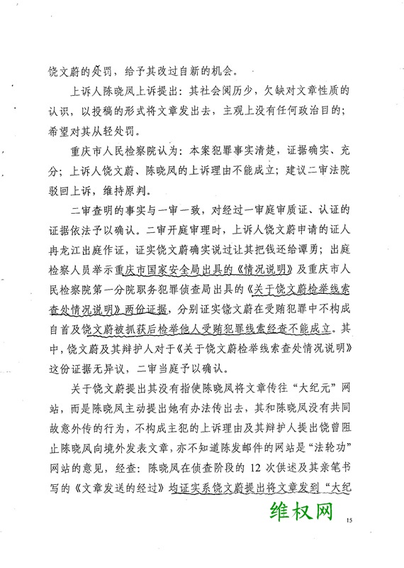 (维权网信息员邓浩文、杨华报道)本网信息员获悉,重庆市巫山县前政法委书记青年才俊饶文蔚因写了52篇随感性文章,被重庆市中级及高级法院以“撰写52篇系列文章,以诽谤、诬蔑、诋毁”,“煽动推翻中国共产党的领导和社会主义制度,颠覆人民民主专政的国家”之“煽动颠覆罪”及存在诸多疑点的“受贿罪”重判12年有期徒刑,剥夺政治权利3年。同时,法院还对另一名被认定帮助饶文蔚发出文章的陈晓凤以犯“煽动颠覆国家政权罪”,判处有期徒刑二年,剥夺政治权利一年。