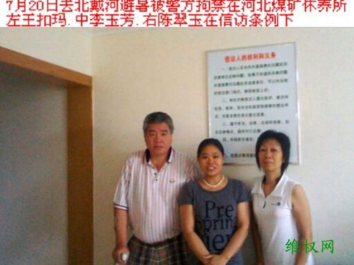 7月20日,上海维权市民李玉芳、王扣玛等四人前往北戴河避暑(21日、22日是双休日,信访办休息不办公,又恰逢北京36度高温,所以想在北戴河避暑2天,等到星期一再信访),不料竟遭当局警方拦截、搜查、遣送、关押。时值中美新一轮人权对话之际,当局又制造了一起践踏人权的恶性事件。