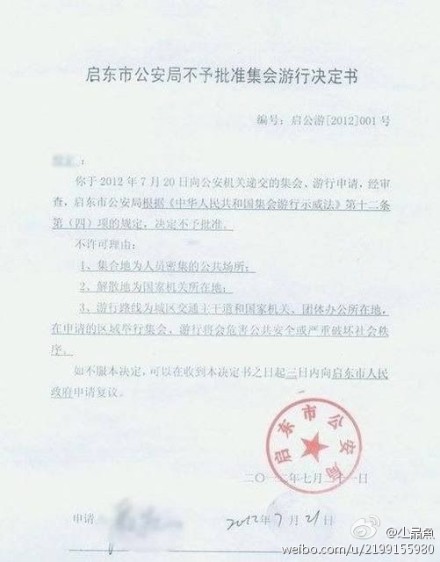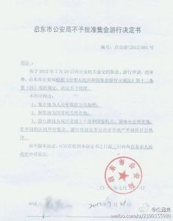 因担忧王子纸业的排污工程会破坏自己和子孙的生存环境,7月20日启东民众向市公安局递交了游行申请书,然而21日公安局以“集会地为人员密集的公共场所”为由不予批准民众的游行申请。25日,大、中在校学生被要求在承诺书上签名,承诺书中指“7月28、29、30日在启东永安广场进行的抵制南通大型达标水排海工程的集会游行为非法活动,如有参与,会受到相应治安处罚,将直接影响进行高校学习深造,乃至影响个人前途命运”,很多学生被迫签下“我坚决做到不组织、不参与、不支持、不围观”的承诺书。