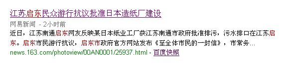 本网信息员在百度上搜索“启东”时,有关民众游行抗议及日本王子纸业的相关信息已不复存在,搜索此前网易网站的《江苏启东民众游行抗议批准日本造纸厂建设》的报道提示为“无法显示网页”。