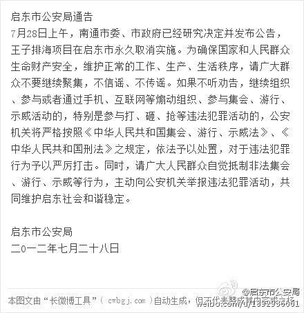 (维权网信息员方斌报道)7月28日,江苏省启东市数万居民上街抗议日本王子纸业向启东附近海域排污项目,居民冲进了市政府,警方与民众对峙,现场发生冲突。当天南通市政府发布公告决定永久取消王子企业排海项目。然而当晚,武警却陆续进入启东市,并伴有电子信号干扰车。同时,网友通过微博发布的现场消息被屏蔽,29日,一名80后孙性女网友因发布现场消息被行政拘留10天并被处罚款500元。