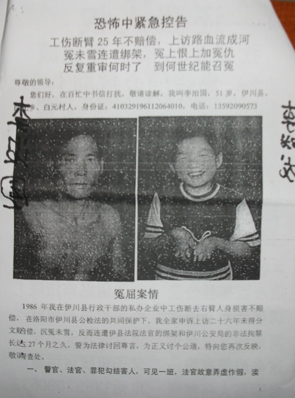 访民李治国控诉说,他于1986年9月在伊川县公安局干部李镇海开办的私营砖厂干活时,被机械绞掉右臂,得不到治疗和赔偿,身为公安干部的李镇海,为了逃避法律责任,使其侄子李俊召冒名顶替该砖厂负责人,大耍无赖,为了停止医治,而将李治国用车强行拖出医院拉到半路仍下不管。