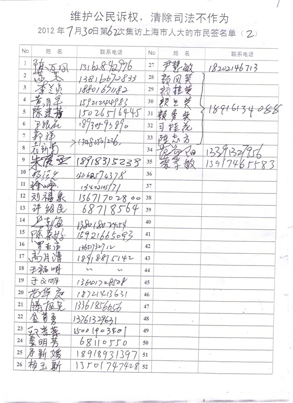 当天有87名上海维权市民为了维护上海1060户家庭的切身利益,第62次请求上海市人大常委会履行法定职责,追究三级法院剥夺公民诉权的违法行为。法院不讲法,老百姓的冤情到哪里去诉?法院渎职侵权随意剥夺公民诉权,人大应该监督查处,人大应该追究违法乱纪的法官责任和法官的腐败行为。如今上海维权市民已经第62次集体请求上海市人大常委会不要再装聋作哑,视而不见。要以“事实为依据”,以“法律为准绳”,保障公民应有的诉权。彻底清除上海市行政管辖区内一切侵害人民群众切身利益的渎职侵权违法犯罪行为,铲除一切腐败根源。
