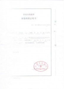 (维权网信息员李凤祥报道)2012年7月23日,济南市拘留所向李兴贵送达《解除拘留证明书》,称“李兴贵现因拘留期满,予以解除拘留。”