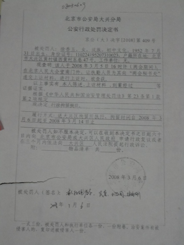 徐香玉拿着法院的生效《调解书》和公安《拘留证》,非常痛苦地说:“从我家遭到强拆至今已经6年多,开发商至今分文未赔,大兴区法院判决(调解书)早已经生效近3年时间,又拒不执行,我上访要求法院依法执行生效文书,反遭公安局报复拘留三次。拘留我的目的就是:我的维权行为,揭露了他们的罪恶。