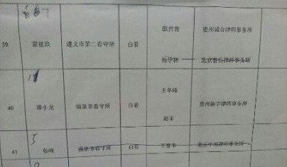 (维权网信息员张成报道)8月6日上午,贵州“黎庆洪涉黑案”辩护团王誓华律师前往贵阳市白云区看守会见自己的当事人蔡峰讨论上诉事宜,看守所接待的工作人员说监管支队和法院出了文件,其中提到的律师不许会见。如下图是贴在工作人员左手边的名单,其中还有另一位辩护团成员杨学林律师。