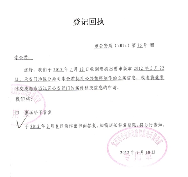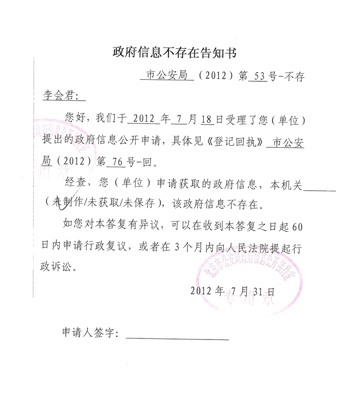 (维权网信息员刘飞报道)8月8日,本网信息员辗转从温江出租车主处获得了一份由北京市公安局政府信息公开接待室出具的《政府信息不存在告知书》,根据这份告知书可以确定,成都温江公安局涉嫌构陷罪名,滥用职权,非法逮捕和行政拘留上访出租车主。
