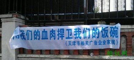 有广告从业者反映,08奥运会时期天津市区内的很多广告牌就拆了,导致一批户外广告公司倒闭,这次再强拆,户外广告公司就都没办法生存了。为了捍卫生存权和就业权,现场有相关广告企业家属打出了“用我们的血肉捍卫我们的饭碗”的横幅。
