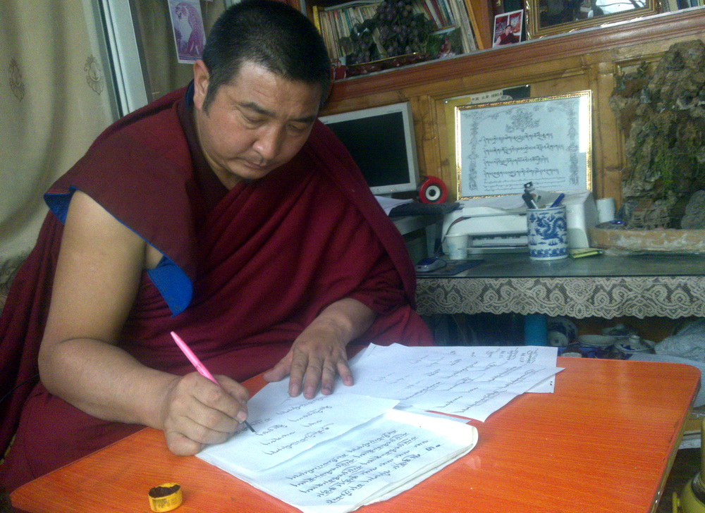 | 喇嘛久美五年来历经四次被捕,而这次,被定罪“涉嫌煽动分裂国家罪”。。。这张照片拍摄于他第三次被捕获释后,在自己的僧舍写作。 |