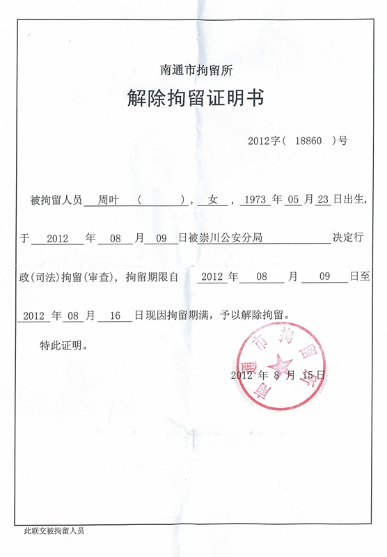 南通市北阁饭店是臭名昭著的黑监狱,关过无数冤民。南通当局将周叶关进黑监狱还不过瘾,又对她作出行政拘留处罚7天的处罚。