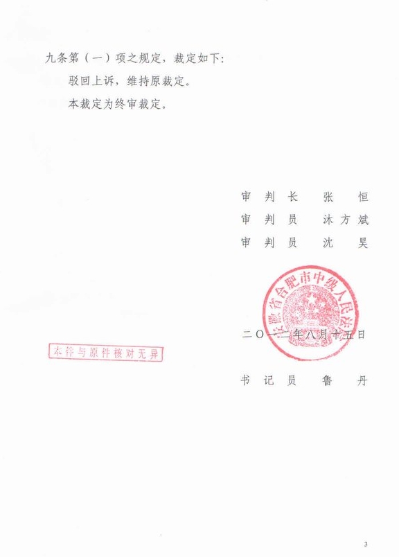 张兵称,他于7月23日到庐江县法院递交上诉书,8月13日合肥市中级法院张法官通知张兵到中院,对他说你超出上诉时限提起上诉。张兵解释,虽然庐江县法院是于7月17日日作出的,但其是19日签收的,故上诉期限应从19日算起,张法官核实后,又问张兵请不请律师,张兵回答,如果开庭必定请律师,不开庭则不请律师。两天后的16日,合肥中级法院作出维持庐江县法院裁定,驳回张兵上诉的裁定。