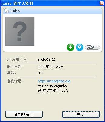 昨天(16日)14:07,推友吴钩霜雪明(@mansonkin)问我:“你skype是否有个帐户叫jinbo19721被黑了, 此帐户到处散播病毒。”14:12我回复说:“那个账户跟我没有任何关系,估计是对我怀恨在心的无耻之徒故意嫁祸于我。我的账户已使用7年,从未换过。”14:23我在推上发表声明:“声明:昨天下午开始我得到消息,有人使用跟我名字相似的skype账户到处散播病毒。我的skype账户已使用7年,从未换过。此次假冒我的名义,应是熟悉网络技术的无耻之徒对我的故意陷害。敬请各位留意,切勿上当。王金波2012年8月16日”。