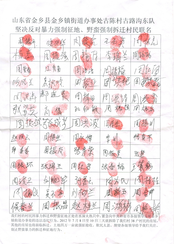 (维权网信息员龚萍、齐宁报道)今天(8月18日 )本网信息员接到山东省金乡县金乡镇古陈村村民联名呼求制止当地政府强征强拆,侵害村民耕地、住房权利的信。本网信息员了解到,古陈村90%的村民不愿意将赖以活命的土地出让,但遭到当地政府野蛮强拆强征。当地政府与村委勾结,在没有经过村民同意,也没有出示任何征地手续情况下,忽然让村民到村委领取每亩41000元的补偿。村民眼看家园难保,被迫联名公开呼吁各级政府领导与社会各界关注,以制止当地政府违法征地行径。下面是村民的公开呼救信及签名: