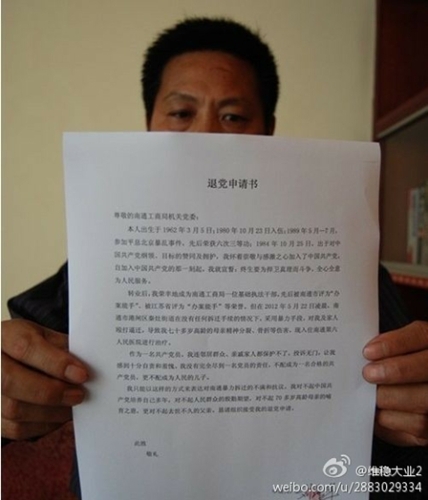 (维权网信息员顾平健报道)江苏南通市工商干部刘海军,生于1964年3月5日,80年10月23日服兵役,入伍第二年入党,89年6月4日参加了震惊世界的平息“天安门暴乱”事件。然而最近,南通市工商干部、老党员刘海军在网上公开声明申请退党,引起广泛关注。