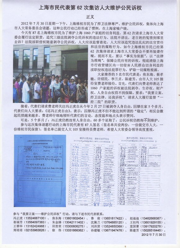 参与这次集体请愿行动的上海市民代表有69人,签名单已提交给 费 老师,希望引起人大常委会领导的重视。