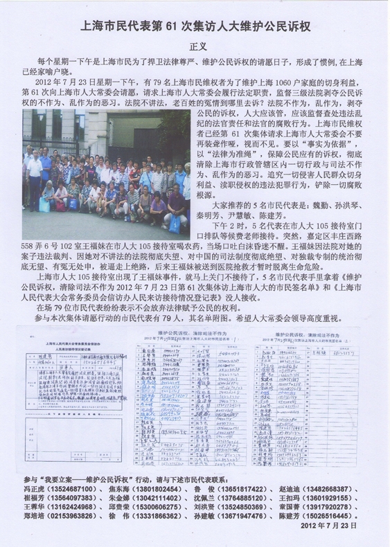 今天,上海69名维权市民为了维护上海1060户家庭的切身利益,第65次请求上海市人大常委会履行法定职责,追究三级法院剥夺公民诉权的违法行为。法官不讲法,随意剥夺公民诉权,人大应该监督查处,人大应该追究违法乱纪的法官责任和法官的腐败行为。如今上海维权市民第65次集体请求上海市人大常委会保障公民应有的诉权,要求彻底清除上海市行政管辖区内一切渎职侵权的违法犯罪行为,铲除一切腐败根源。
