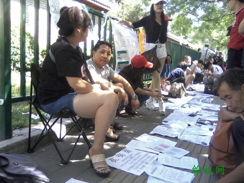 (维权网信息员关小令报道)22日上午,各地在京访民自发前往全国人大信访办、国务院信访办、中纪委信访办(访民俗称三骗胡同)胡同口西侧,晾晒(称为见阳光)信访材料,发表演讲,号召全国访民觉醒,不要再入三骗胡同的门,应将自己的冤情曝露于阳光之下,警醒国民。