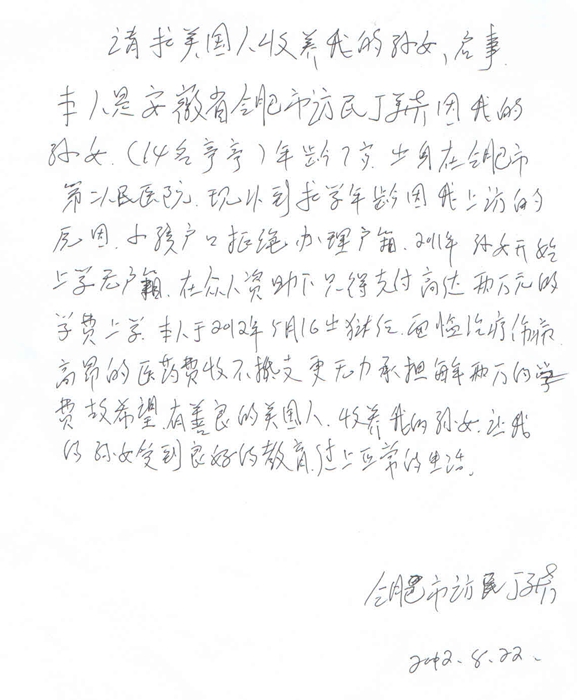 由于孙女的生存权和受教育的权利无法得到保障,为了能让孙女有一个健康的成长环境,能够接受良好的教育,丁美芳希望有美国家庭收养她的孙女。