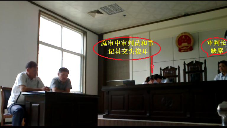 违法违纪之九:该法庭不设书记员专席,书记员坐到了法官席上,与审判员交头接耳。