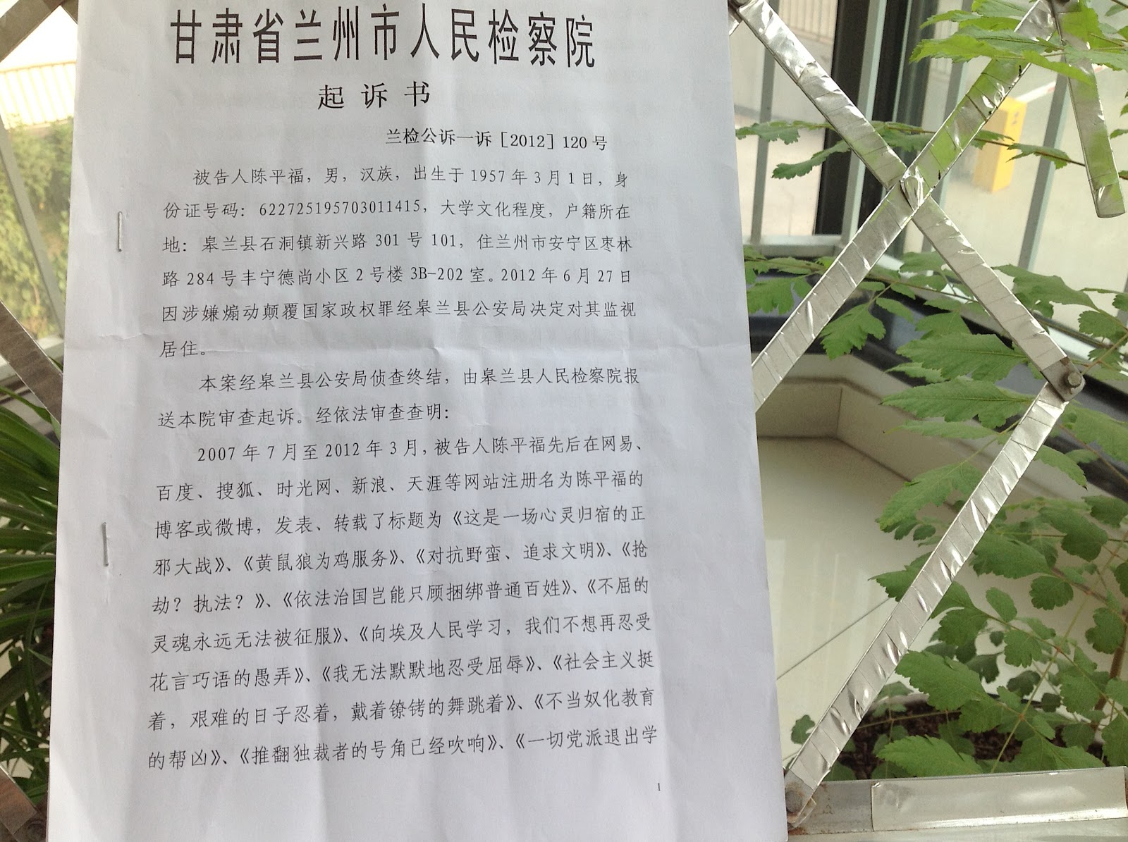 陈平福是因在自己博客上撰文谈政治,被兰州当局指控煽动颠覆国家政权罪的。详见本网相关报道(陈平福被控“煽动颠覆国家政权”,因病被监视居住(图)http://wqw2010.blogspot.com/2012/04/blog-post_7614.html)