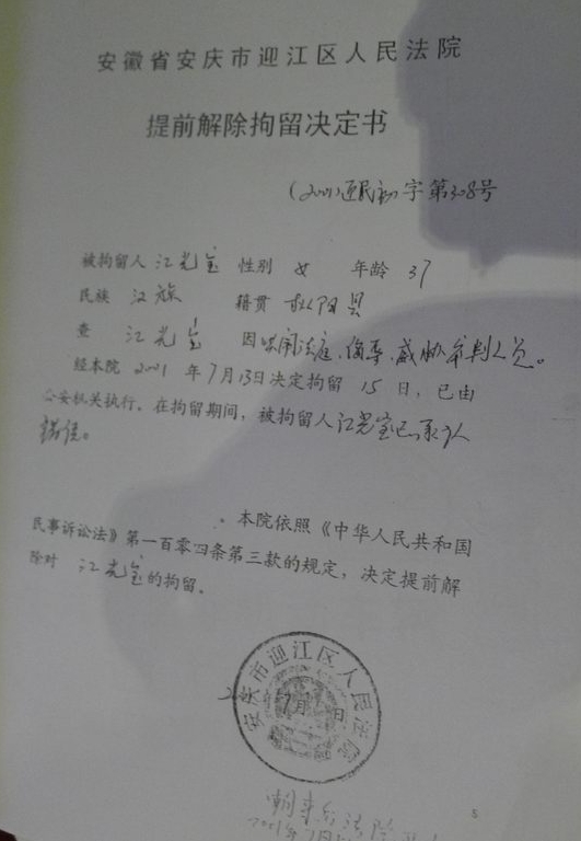 江光宝于2000年11月到安庆市郊区法院(现宜秀区法院)起诉出租车车主、驾驶员,要求人身损害赔偿,法院追加太湖县国土资源局为第三人。根据(2000)郊民初字第607号《民事判决书》,在审理时,被告提出只能负担石化医院的医疗费用,原告擅自转院的医疗费用应由原告承担,太湖县国土资源局述称“我单位一直是积极处理此次交通事故,交警事故大队处理时是因为原告不配合而未果,原告对自己扩大的费用应自己负担。”该判决书本院认定部分有“因原告江光宝在石化医院治疗,未经许可,擅自转院治疗,因此,原告要求被告及第的诉讼请求,违反法律规定,本院不予支持。”仅判决支付了石化医院的1144.9元费用,对此江光宝认为判决违法,因为她向法院提供了交警支队事故处理大队出具的对其到其他医院治疗表示同意的证明,可法院就是不予采信。二审判决则发回一审法院重新审理,后来又改为迎江区法院审理,2001年7月4日迎江区法院法官曾带江光宝到合肥市中医学院第一附属医院检查,李业甫医生回答法官询问,称江光宝双手腕关节、双肩、双背疼痛是车祸造成的。李业甫医生诊断:颈椎病(外伤性)、肩周炎(外伤性)、创伤性关节炎,安庆市迎江区法院7月12日作出(2001)迎民初字第308号《民事裁定书》裁定太湖县土地管理局先预给付原告江光宝人民币5000元作为治疗费用。其后,江光宝在领取医疗费之前问法官,自己的伤情就是因为无钱治治停停才加重的,这5000元钱不够怎么办?法官不予回答,江光宝找法院院长反映无果,反被法院以“哄闹法庭、侮辱、威胁审判人员”为由拘留15天,带上手铐送公安局拘留所执行。江光宝在拘留所中绝食5天,被迎江区人民法院决定提前解除拘留。