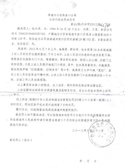 2012年8月16日一早,包水英老人与其他20多位访民到南通市拘留所去迎接即将释放的拆迁维权人士周叶,被警察抓获,并拘留7天。拘留期满,包水英老人将提起行政复议申请。