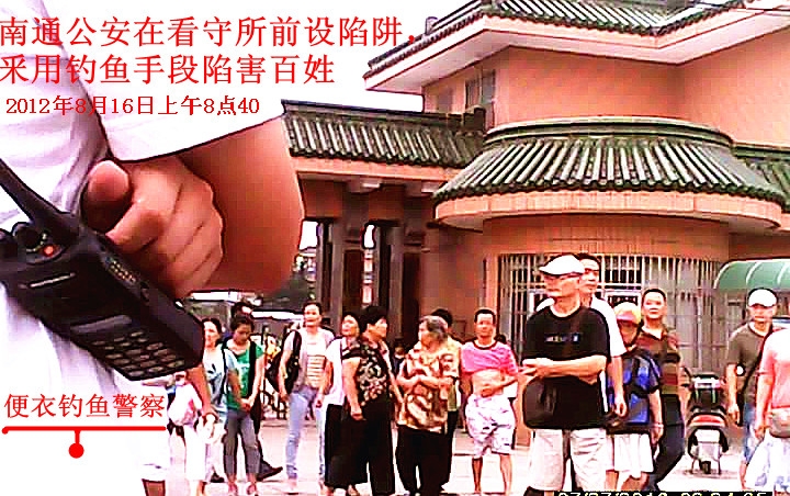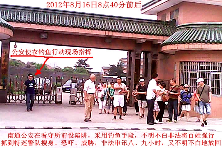 2012年8月16日,是南通市维权人士周叶拘留期满获释的日子。众多维权人士一大早就自发地前去迎接周叶,当他们来到关押周叶的拘留所时,早被等候在拘留所周围的特警和警察逮个正着,有25个人被抓。当时的警察足足有100多人,是有备而来。受害人认为,这是钓鱼执法。