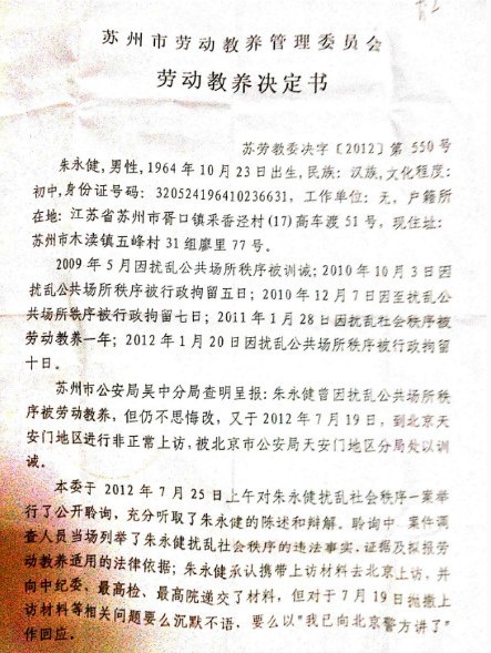 (维权网信息员李军综合报道)江苏省苏州市访民朱永健因为在北京上访,2012年7月19日坐公交车路过天安门时向车窗外抛洒上访材料,于7月30日被苏州劳教委认定扰乱公共秩序,处以劳动教养1年。