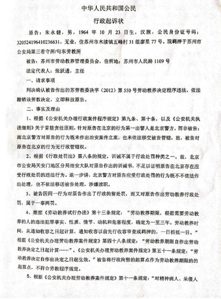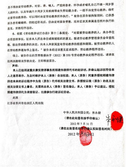 7月31日,郑建伟律师代表朱永健向苏州沧浪区法院递交了行政起诉状,要求判决苏州市劳教委撤销对朱永健的劳教决定。