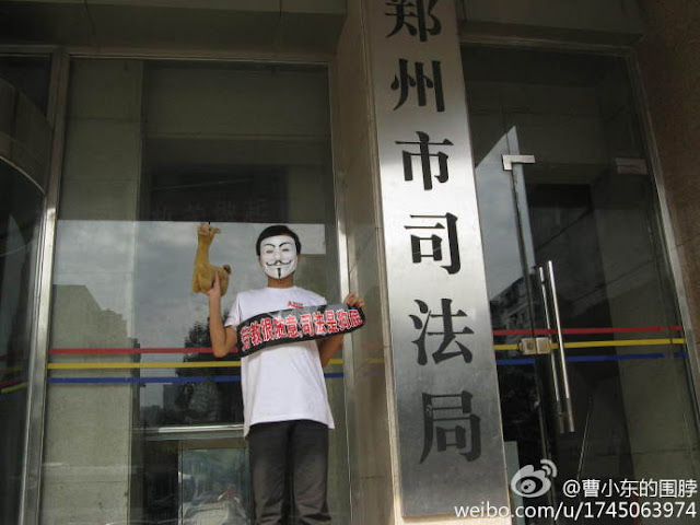 9月4日上午9点多,河南省郑州市司法局门口出现一个年轻小伙,头戴“v字仇杀队”面具,身贴标语“劳改很随意,司法是狗屁”。 随后10点多,新浪网友@邓二晃晃发消息:“你要不废除劳教老子就废除了你。”而后,@曹小东的围脖发微博说:“刚才从司法局门口走过,看到一青年举着草泥马,身上贴着“劳教很随意,司法是狗屁的话。”“现在的年轻人真了得,不过蛮担心他的安全,他会不会因此被劳教”。截止发稿,这些微博已经转发了近600条。