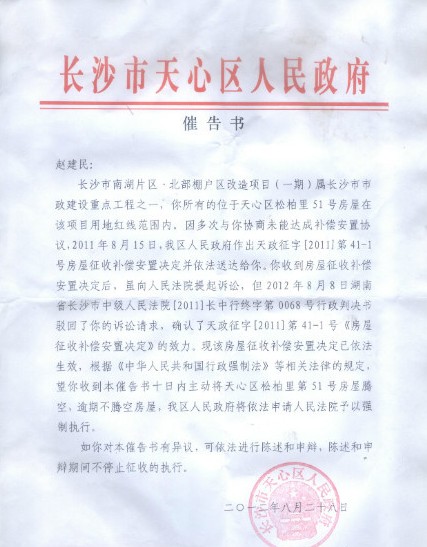 8月28日,天心区政府向赵建明下发了催告书,限其在十日内腾空房屋,否则强制执行。
