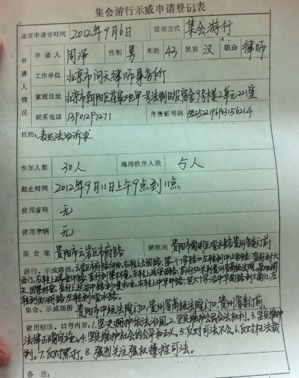 9月5日,周泽律师、张磊律师以公民身份到贵阳市公安局提交了游行示威申请书。