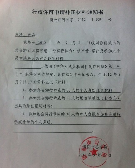 9月6日上午在贵阳市公安局治安支队填了游行示威申请登记表。贵阳市公安局给周泽律师、张磊律师出具了关于提出集会游行示威申请的补正材料通知书。