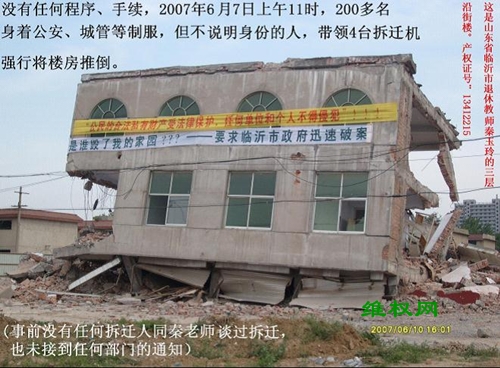 本网信息员采访了暴力强拆受害人之一的退休女教师秦玉玲了解到:她的三层沿街楼所处土地在不知情中早已被政府收储,并于2006年5月30日以72万/亩的价格将国有土地使用权卖给了开发商。理应按《山东省城市房屋拆迁管理条例》第57条的规定给予补偿。而市政府却强行按集体土地上附着物给予廉价补偿,因严重侵害了他们的利益,秦玉玲不同意在所谓的拆迁协议上签字。