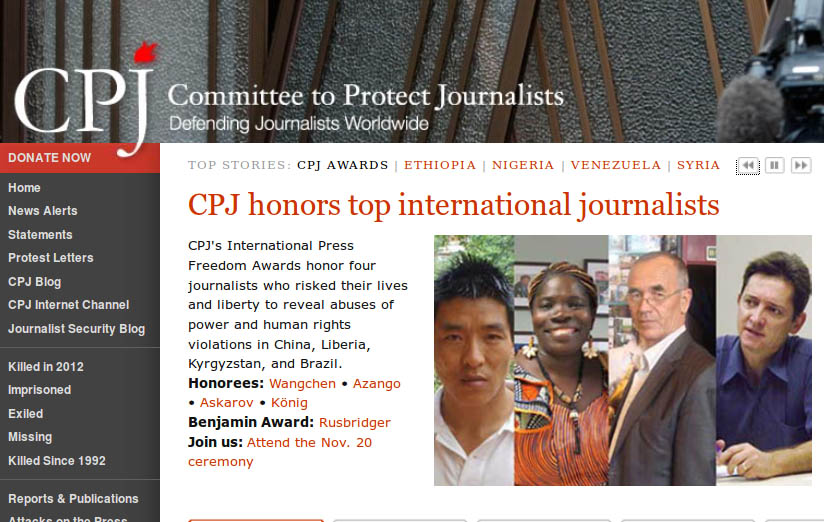 | 藏人电影人顿珠旺青(当知项欠)在获得澳大利亚齐氏文化基金会“推动中国进步奖”特别奖的同时,又获国际组织“保护记者委员会”2012年度“国际新闻自由奖”(CPJ Press Freedom Awards)。图为“国际新闻自由奖”获得者的图片,顿珠旺青为第一人。 |