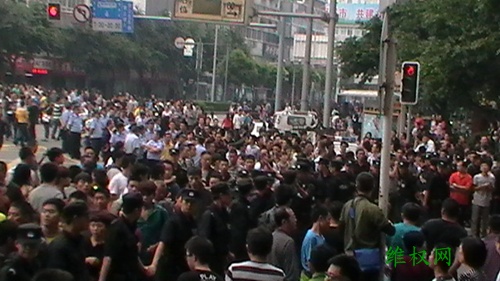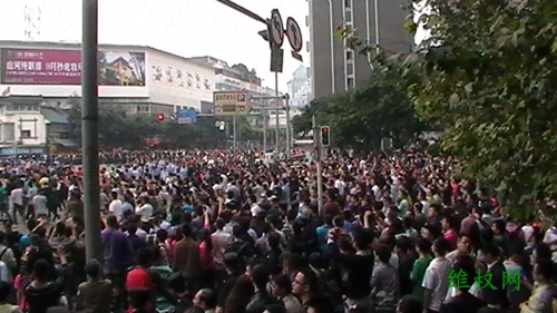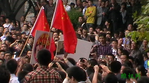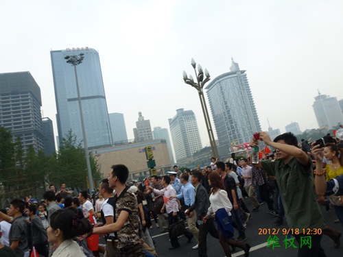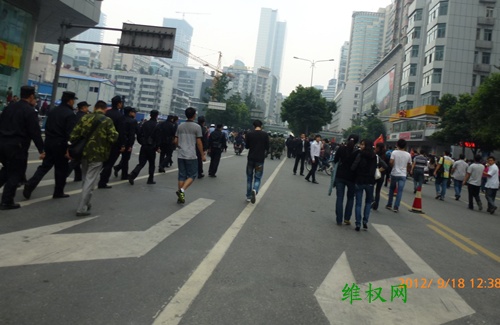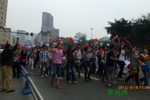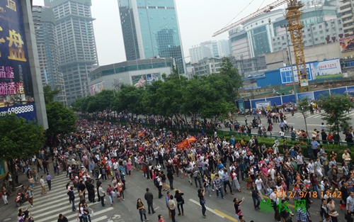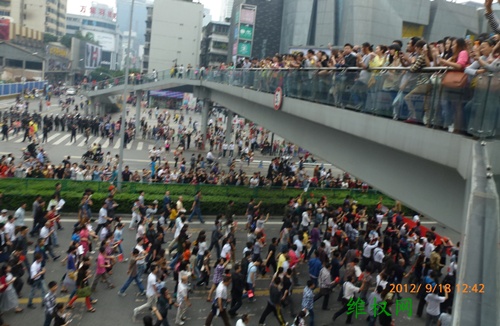 (维权网信息员张勇报道)9月18日,成都举行了上万人参加的“保钓游行”,除之前的常规口号外,增加了“理性游行、勿伤国人”的口号,上午十点多钟,曾遭到警方强行驱散,个别人与警方发生了多次肢体冲突,但由于后来聚集人数越来越多,警方没有再试图驱散,而是全程护航,技术性隔离,即使如此,至中午两点左右,参与人数至少也有一两万人,而整个游行线路周边围观的群众加起来至少十万以上。