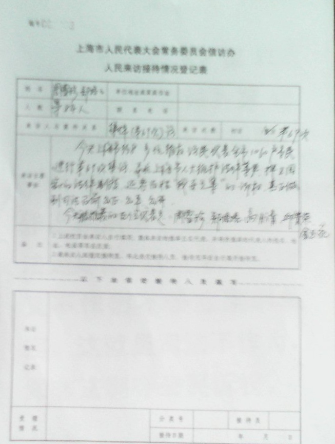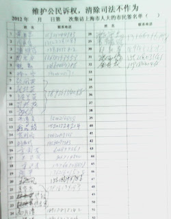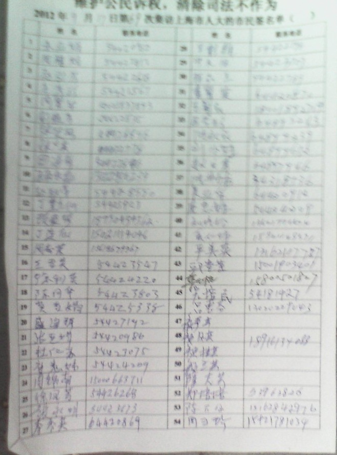 (维权网信息员晨晓报道)9月17日星期一下午2时,按照惯例8 1名上海市民维权代表到达上海市人大常委会信访大厅,在《维护公民诉权,清除司法不作为》集访上海市人大的市民签名单上签上自己的名字。为了捍卫法律尊严,为了维护上海1060户家庭的诉权,维权代表们第69次集体向上海市人大常委会请愿,请求上海市人大常委会履行法定职责,履行国家法律,以“事实为依据”、以“法律为准绳”,保障公民应有的诉权,彻底清除上海市行政管辖区内一切行政与司法不作为、乱作为的恶习。查处一切渎职侵权剥夺公民权利的违法犯罪行为,铲除一切腐败根源。
