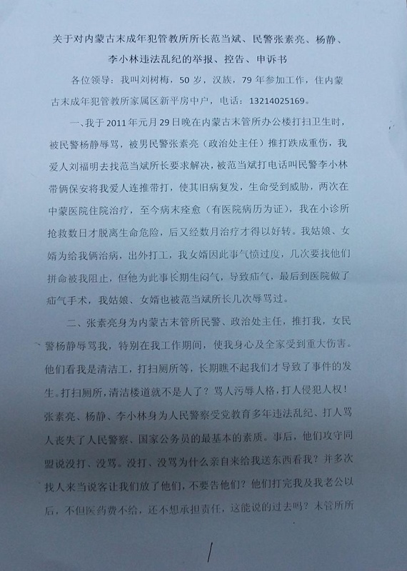 (维权网信息员关小令报道)家住内蒙古未成年犯管教所家属区的访民刘树梅,是内蒙古未成年犯管教所的专职清洁工,在工作中被司法女警杨静辱骂时,男司法干警张素亮将刘树梅暴力伤害致重伤,其丈夫刘福明要求管教所所长范当斌解决问题时,所长范当斌指使手下民警李小林带领保安又将她丈夫刘福明打伤住院。